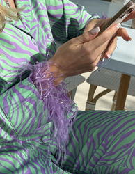 This luxurious viscose silk-feel pajama set features a bold turquoise and green zebra-inspired print and glamorous detachable purple ostrich feather trim sleeves — allowing you to switch effortlessly between a statement look and a sleek minimalist style. Perfect for stylish sleep or elevated loungewear.