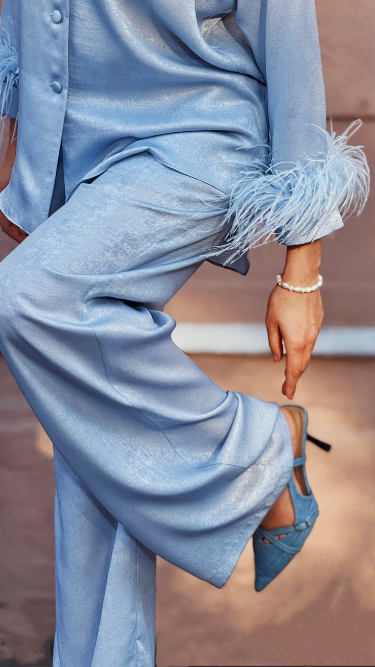 A suit created for those who appreciate elegance in every detail. The subtle sheen of the fabric, the gentle touch of silky texture, and the statement ostrich feather accents on the sleeves make it a true masterpiece of modern fashion.